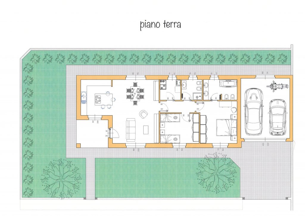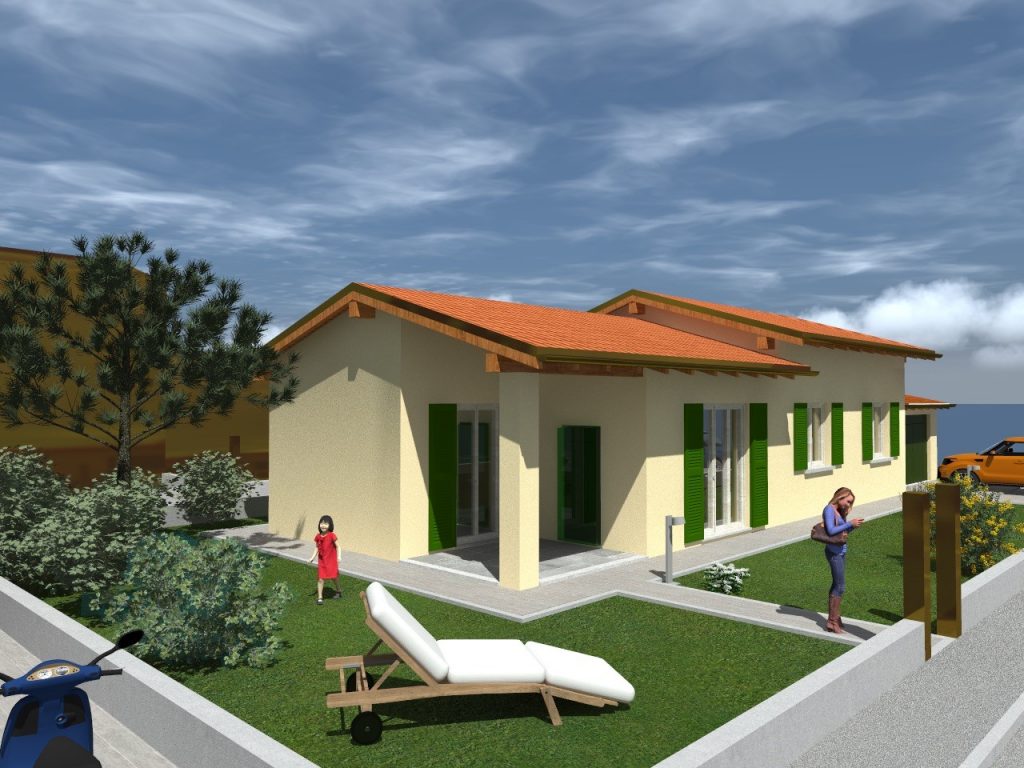 Villa monopiano composta da: soggiorno, cucina abitabile, due camere da letto, due bagni, locale tecnico/lavanderia, box auto doppio, portico e giardino privato. Completano le dotazione dell’unità: cancello elettrico, porta sezionale di accesso box motorizzata, porta esterna blindata, impianto di riscaldamento a pavimento e climatizzazione estiva con pompa di calore, VMC (ventilazione meccanica controllata)videocitofono, impianto TV, pannelli fotovoltaici, predisposizione impianto d’allarme e di video sorveglianza. Finiture interne da personalizzare a scelta dell’acquirente.